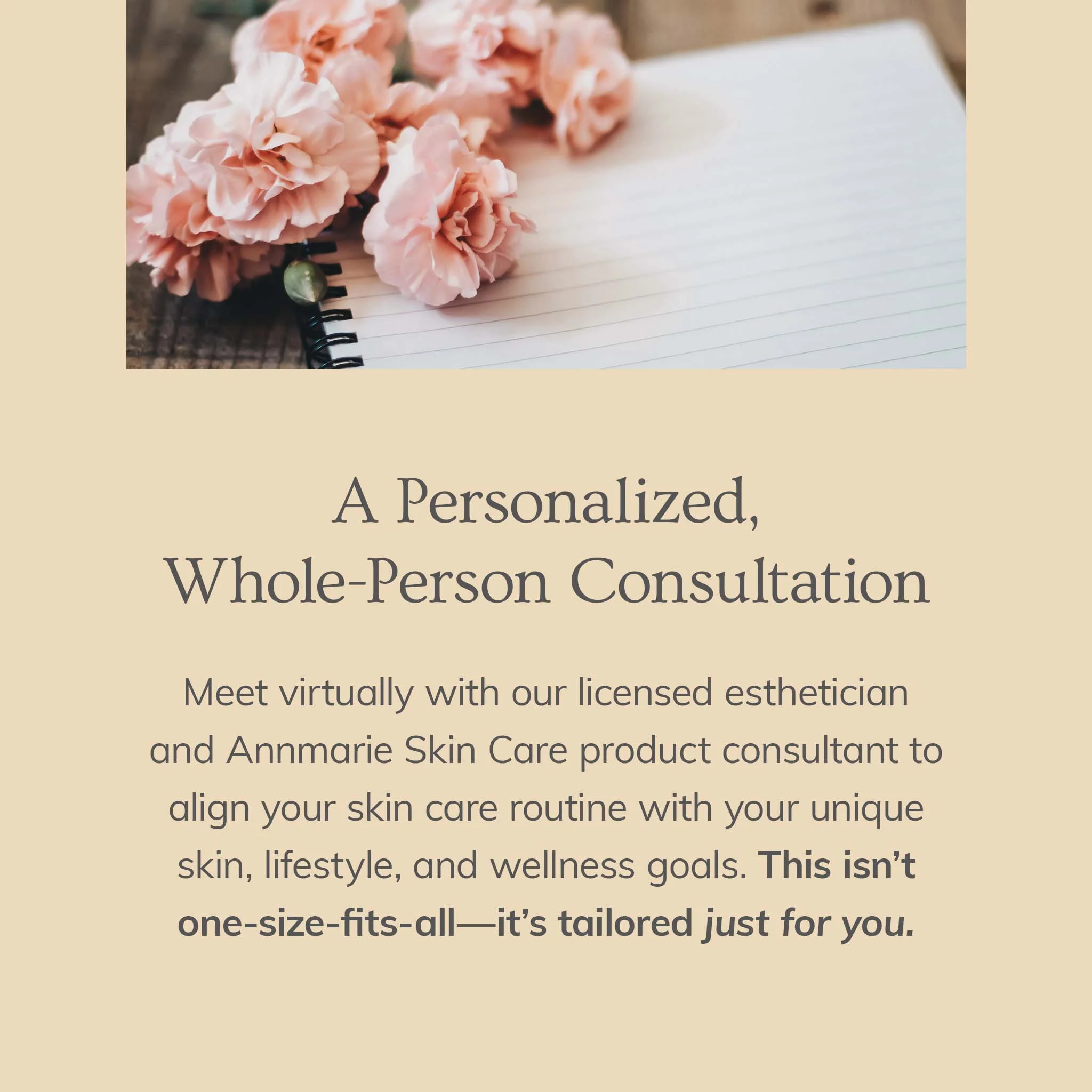 Together, you’ll explore what’s really going on beneath the surface and co-create a personalized ritual using Annmarie Skin Care’s wildcrafted products. You'll leave with clear next steps, radiant confidence, and a routine that fits your life.